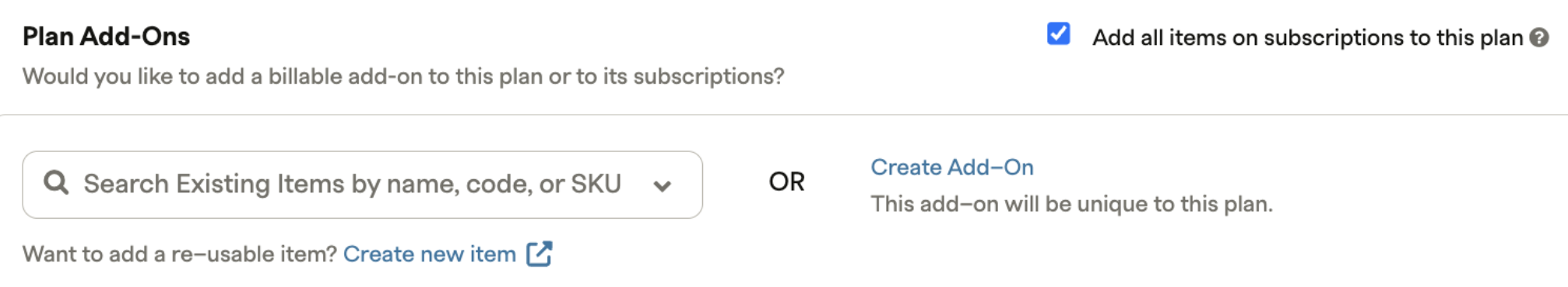 6. Note that in order to add this item to your Recurly subscriptions, those subscriptions will need to have the allow_any_item_on_subscriptions parameter set on go-forward and pre-existing subscriptions. The below plan-level setting Add all items on subscriptions to this plan will set this on go-forward subscriptions. To migrate your existing subscriptions to use this parameter if necessary, please reach out to Recurly support directly for assistance.